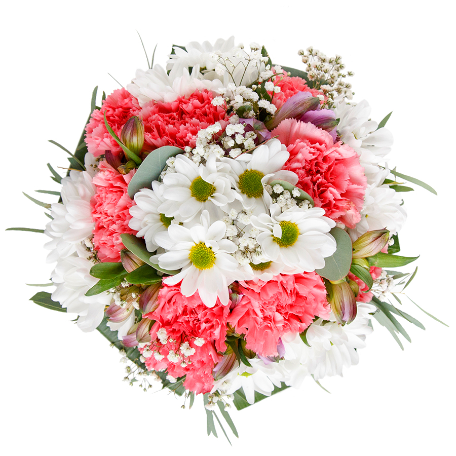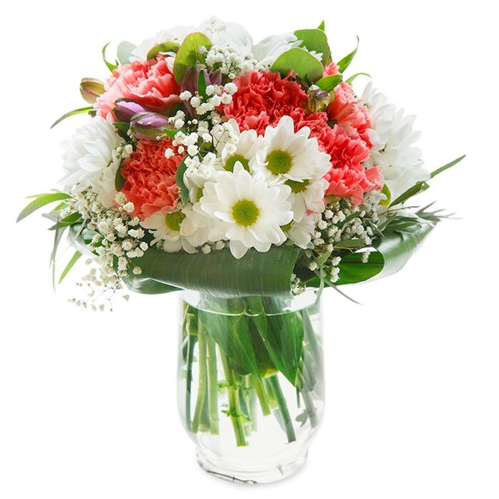 Bringing a breath of springtime to Welling, this enchanting bouquet rises in a square white gift bag, every stem radiating care and artistry. Fluffy coral and red carnations, their petals elegantly ruffled, mingle with snowy white daisies whose lime-green centers add a burst of playful brightness-much like neighbourhood gardens basking in Oxleas Woods' morning light. Wisps of baby's breath drift between the blooms, adding softness and charm, while hints of tightly furled, purple-tinged buds promise moments of discovery. The whole bouquet is encircled by a generous fan of glossy dark green leaves, creating a sense of fullness and gentle enclosure. The white bag's wide ribbon handles offer easy carrying, making this an ideal gift for birthdays, anniversaries, or simple gestures of kindness across Welling. With a clean, pure white background showcasing every petal and leaf, the composition glows with energy, freshness, and heartfelt local spirit-a perfect tribute to the joy of giving or the beauty found in Welling's vibrant floral traditions. A radiant bouquet, evocative of spring's gentle energy in Welling, is expertly arranged to capture both joy and tranquil renewal. At its center, dazzling white daisies with vivid green-yellow eyes are surrounded by coral-pink carnations whose ruffled petals impart texture, movement, and warmth-echoing the bloom-laden paths of nearby Oxleas Wood. Wispy sprays of baby's breath weave delicately through the arrangement, their soft, cloudlike forms heightening the display's lightness and charm. Eucalyptus leaves and deeper green foliage provide a lush, natural base, while glimpses of unopened alstroemeria buds tinged in blush and violet introduce an expectant, sophisticated note. The bouquet's round shape and precisely balanced composition reflect both care and craftsmanship, radiating a sense of happiness and hopeful anticipation-making it a perfect gesture for birthdays, congratulations, or brightening a friend's door along the High Street. With an undercurrent of gentle floral fragrance and a crisp, uncluttered presentation, this arrangement embodies the heartfelt artistry and community spirit behind every local flower delivery from Welling. This bouquet radiates the warm community spirit found all through Welling, its coral-hued carnations forming a plush and lively centre. The blossoms' ruffled edges shimmer in the light, surrounded by white daisies and chrysanthemums that open with fresh green hearts-a nod to both purity and the promise of spring in local parks. Baby's breath weaves a diaphanous softness throughout, balancing the bolder forms with dreamy, cloud-like grace. Complementing the blooms are glossy broad leaves and slender green fronds, creating a layered base that feels as nurturing as the neighbourhood's leafy lanes. Unopened magenta alstroemeria buds linger at the margin, ready to transform the colour dynamic in days ahead. All are supported by a clear glass vase, where water glistens beneath visible green stems, assuring the bouquet's vibrant health. The bright, even illumination and pristine white background ensure focus remains on each exquisite detail. Beautifully arranged, this bouquet captures a moment of happiness, making it a perfect gift for birthdays, celebrations, or heartfelt thanks-delivered directly to homes across the Welling area with classic floristry care.